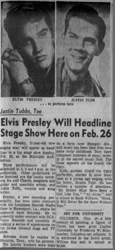 Journal : ...Presley est sous contrat avec le Louisiana Hayride Radio Show à Shreveport, en Louisiane, où il apparaît chaque samedi. Il est actuellement sous contrat avec RCA. Victor Records et fait actuellement une série d'apparitions sur la scène de Jackie Gleason et dans le spectacle TY. Entre les tournées, il réside à Memphis, au Tennessee, avec ses parents. The Louvin brothers , sont nés dans une ferme près de Henegar, en Alabama, et la musique a été leur premier amour depuis leur plus jeune enfance. Ils ont composé de nombreuses chansons, la plupart dans le domaine de la musique sacrée. L'équipe apparaît sur le Grand Ole. OPTY. Tubb, un autre interprète du Grand Ole Opry, a commencé dans le show business à un jeune âge en chantant avec son père, Ernest Tubb...
