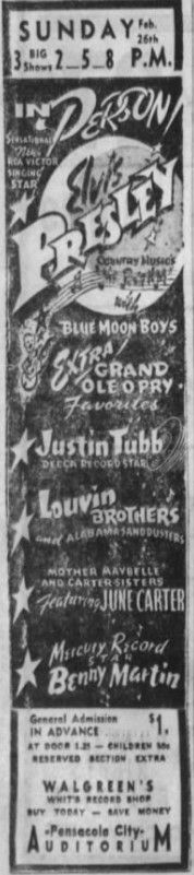 Malgré les appréhensions, Ron Touton et Marion Jones, DJ de la radio WNVY de Pensacola, ont réussi à y introduire le rock and roll en jouant des disques lors d'une série de concerts pour adolescents le dimanche. Le 26 février 1956, Elvis, Scotty, Bill et DJ y ont fait leur première et unique apparition ,donc.