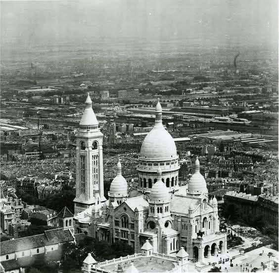 La basilique du Sacré-Coeur de Montmartre et la banlieue industrielle de Paris. 1953