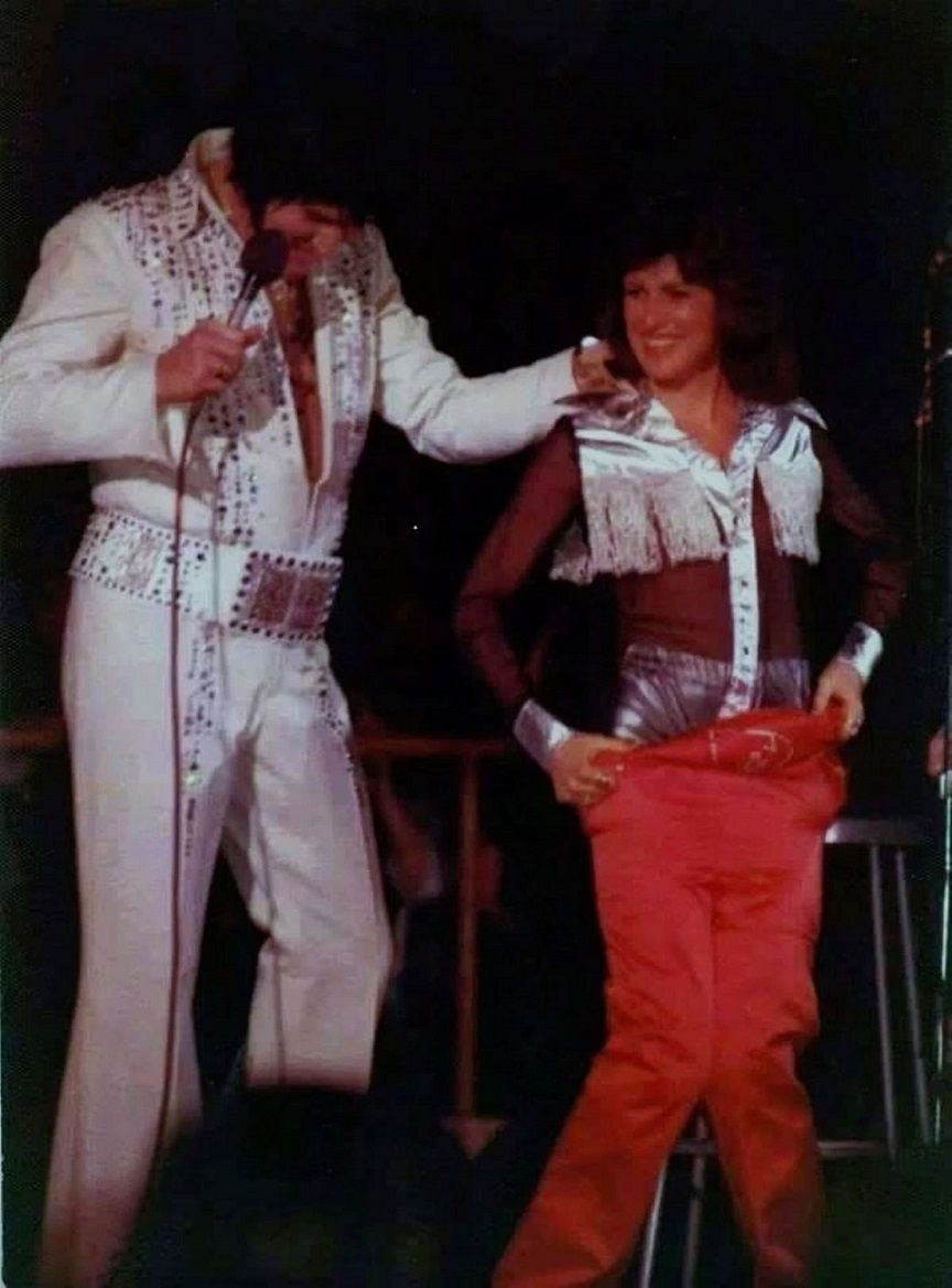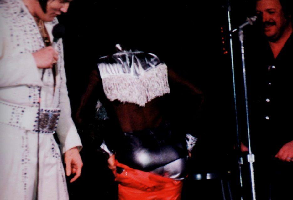 Il se fait offert un habille ,qui devait sans doute être destiné à Lisa .Elvis ,par humour, fait essayer la "salopette" rouge à KATHY WESTMORELAND ,déjà l 'habille est trop petit en plus elle doit l'enfiler sans enlever ce qu'elle a bien évidemment .Jolie moment de rigolade .