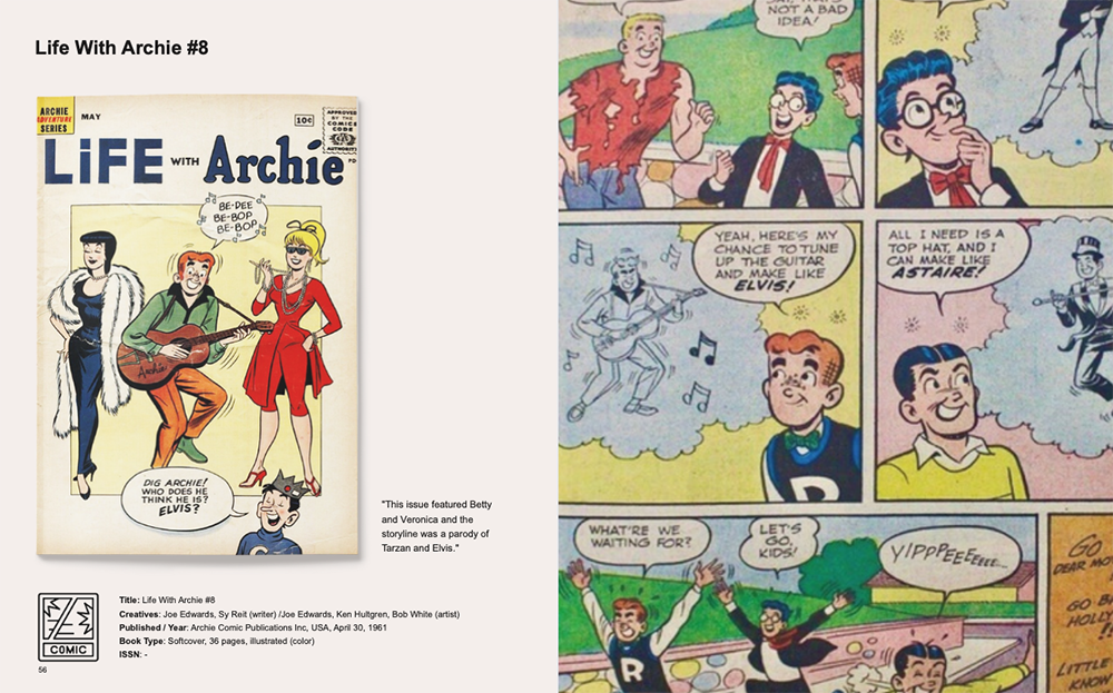 J'ai également été pris au dépourvu par l'impact d'Elvis dans les différentes bandes dessinées du groupe Archie dans les années 1950 et au début des années 1960. Elvis était un nom et un thème commun dans Archie, Jughead's Folly, Betty & Veronica, Archie's Annual, Archie's Joke Book, Life with Archie, Pep et, l'année dernière, la série Archie 55.