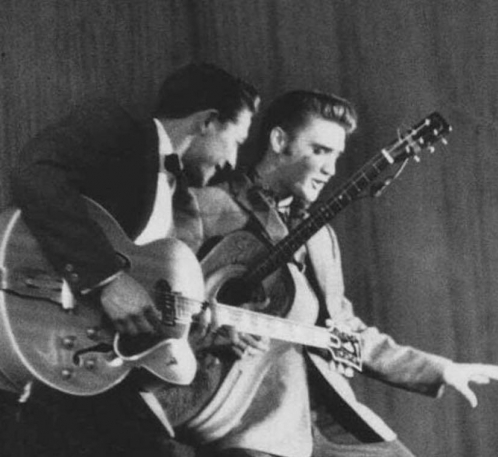 photo poste dernierement par JIMMY PAGE (led zeppelin) sur intagram .... Le premier guitariste d'Elvis a été une source d'inspiration importante pour Jimmy Page à l'époque. Page écrit avec la photo: «Ce jour de 1999, j'ai croise Scotty Moore aux studios Air Studios. Avec son son rockabilly typique, il a joué sur les premiers enregistrements d'Elvis avec Sun, puis de RCA. Il était fantastique! C'est dans les années 1950 que ces types de parties de guitare m'ont montré l'importance de la guitare électrique dans la musique. ”